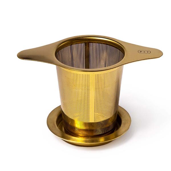 Practical stainless steel, super-fine mesh strainer with anti-drip coaster that doubles as a lid and P & T branding. Perfectly suitable for any type of tea, in mugs or tea pots. It comes into two colour : silver or gold