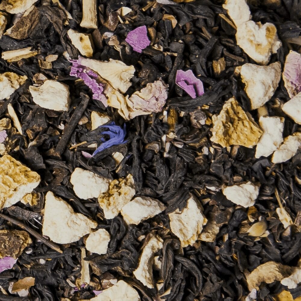 Chinese black tea* (47%), cocoa nibs*, citrus peels*, honeybush*, liquorice root*, rose petals*, cornflower petals*, vanilla bits* *certified organic