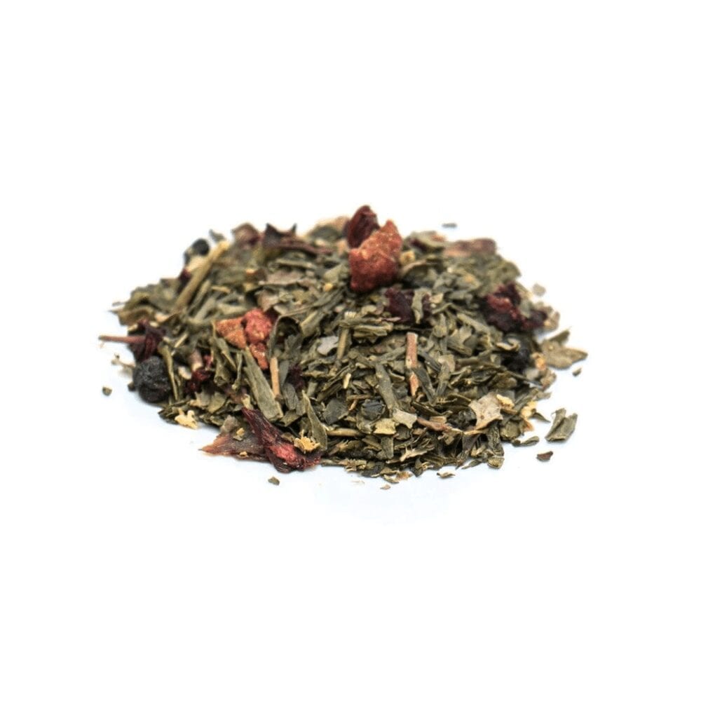 A lively organic green tea blend with a spritz of strawberry, hibiscus and a dash of basil