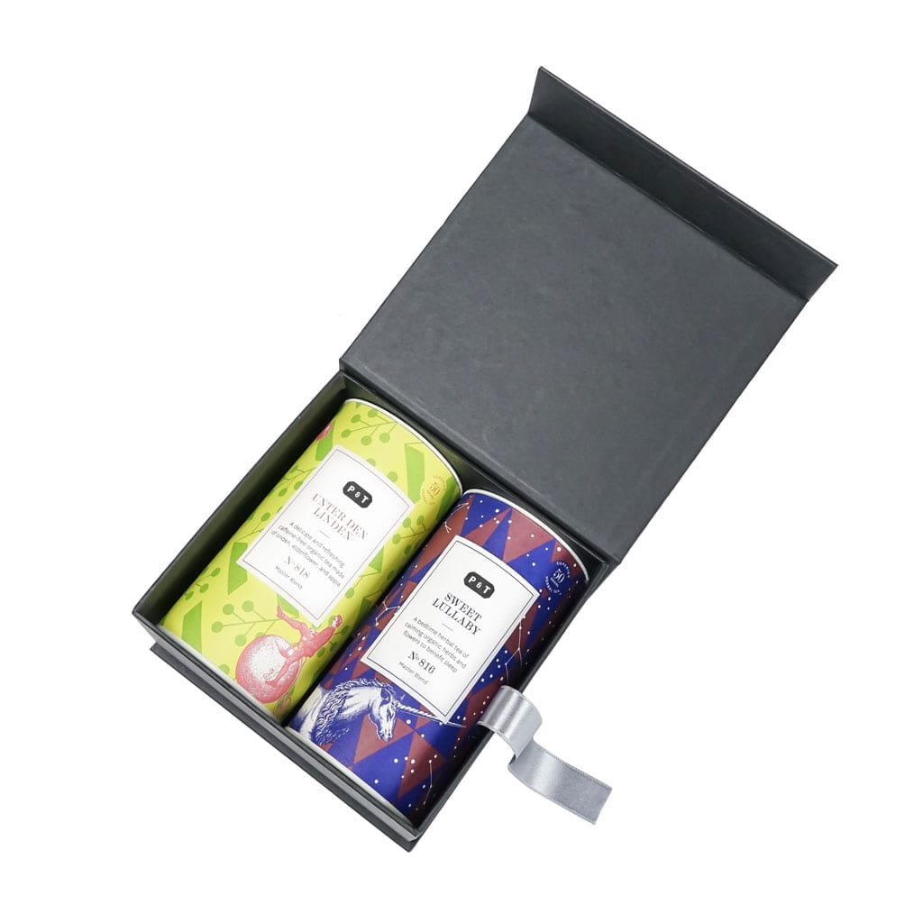 A pair of finely balanced caffeine-free organic herbal blends to enjoy day and night. This special box contains two Master Blend caddies: Unter den Linden Caddy and Sweet Lullaby.